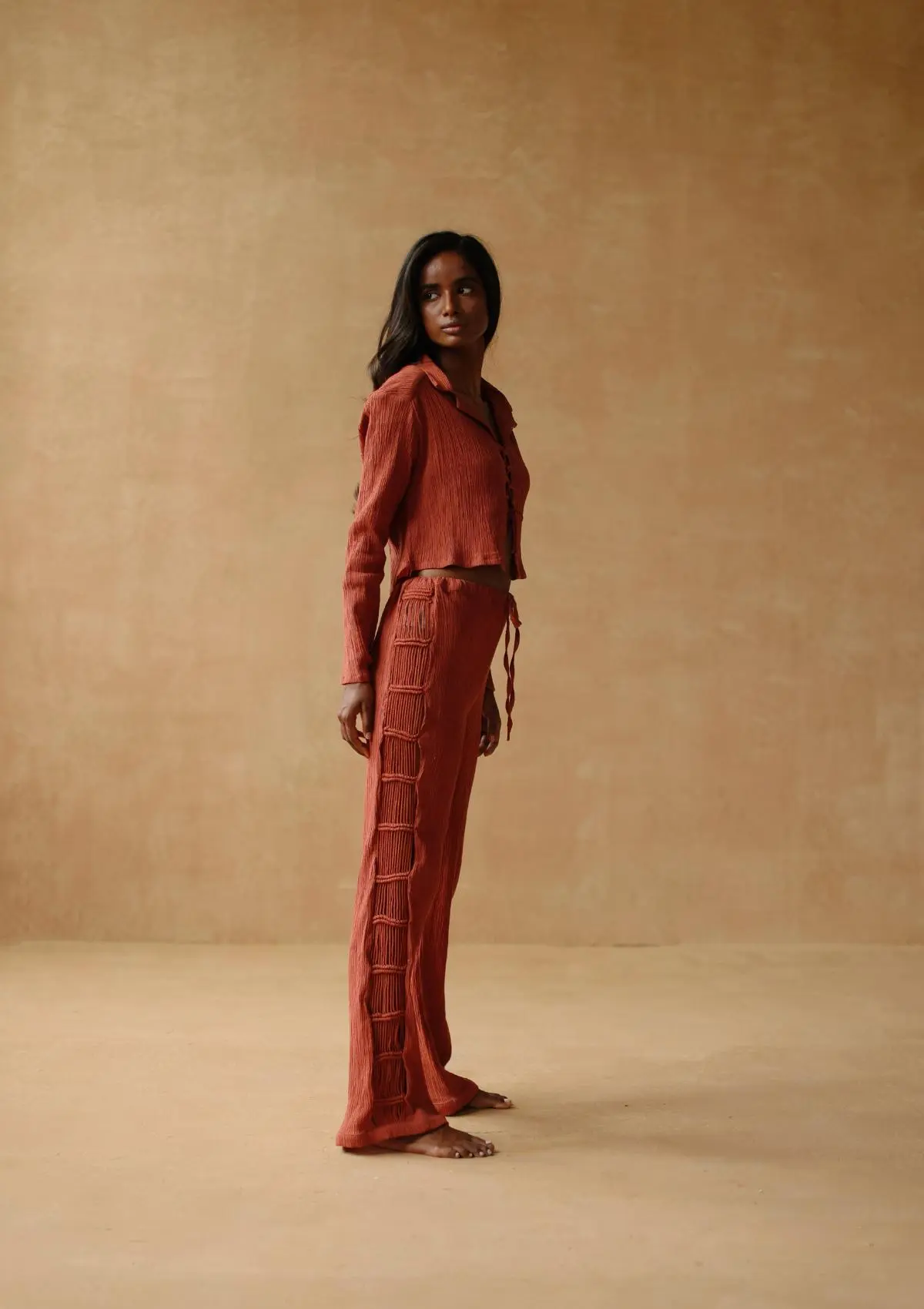 The standout feature is its handcrafted macramé tie-up fastening, adding a touch of bohemian charm. This intricate detailing enhances both style and functionality, creating a unique statement piece.