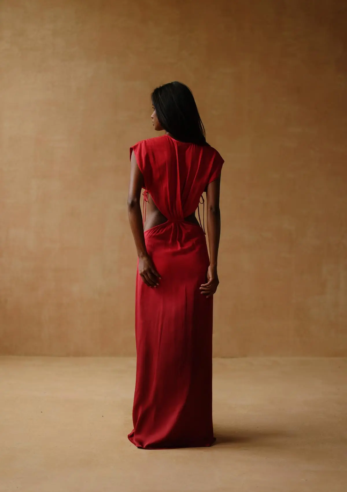 The dress features delicate petal-shaped sleeves that tie at the sides, adding a romantic touch. A deep V-neckline meets intricate pleat detailing at the midriff, enhancing the silhouette. The seductive cutout drapes effortlessly over the hips, flowing into a graceful maxi length.