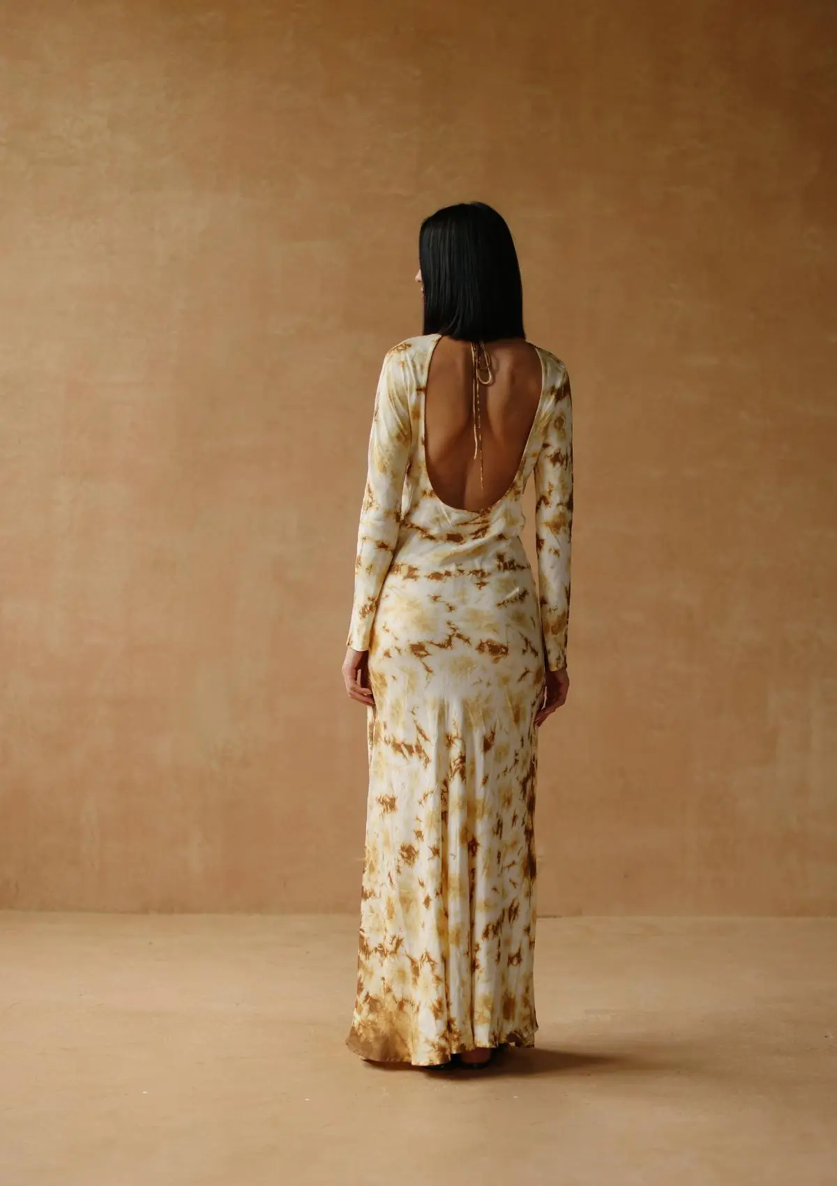 A trendy front tie-up detail adds charm, while the deep back design creates a striking silhouette. Flowing effortlessly, this dress flatters every movement, making it ideal for any occasion.