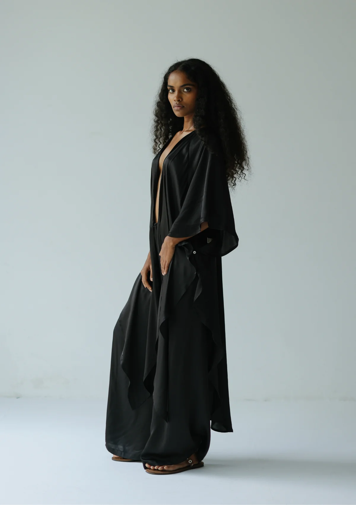 The angel sleeve design adds elegance, while the Japanese pearl button fastening under the arm allows for multiple styling options. Wear it tied as a top or let it flow open as a chic cover-up.