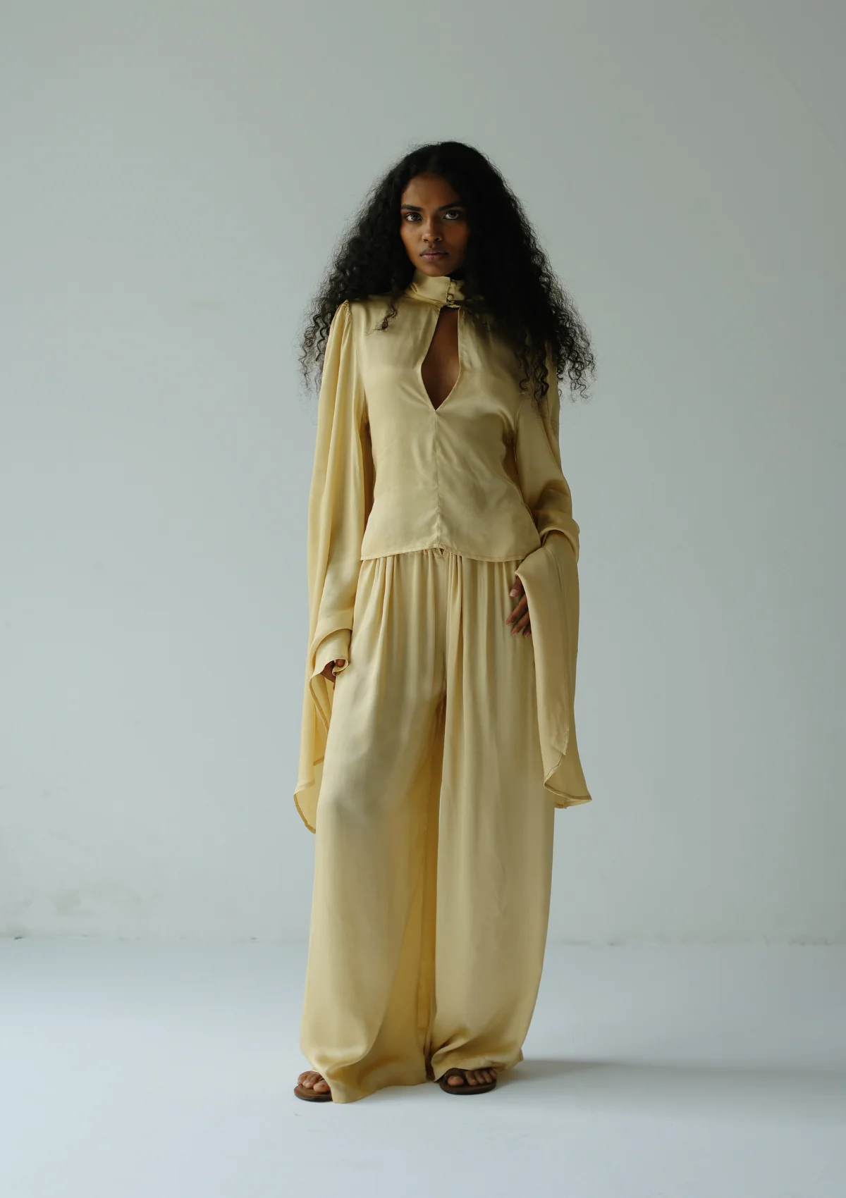 The Roma Top is designed to make a quiet statement. Featuring a delicate keyhole detail with buttons at the neckline and soft flared sleeves, it’s that effortless piece that elevates your everyday look. Lightweight, flattering, and easy to pair—your new go-to top for days you want to feel polished with zero effort. Wear it with a completely open neck or closed as seen here.Â