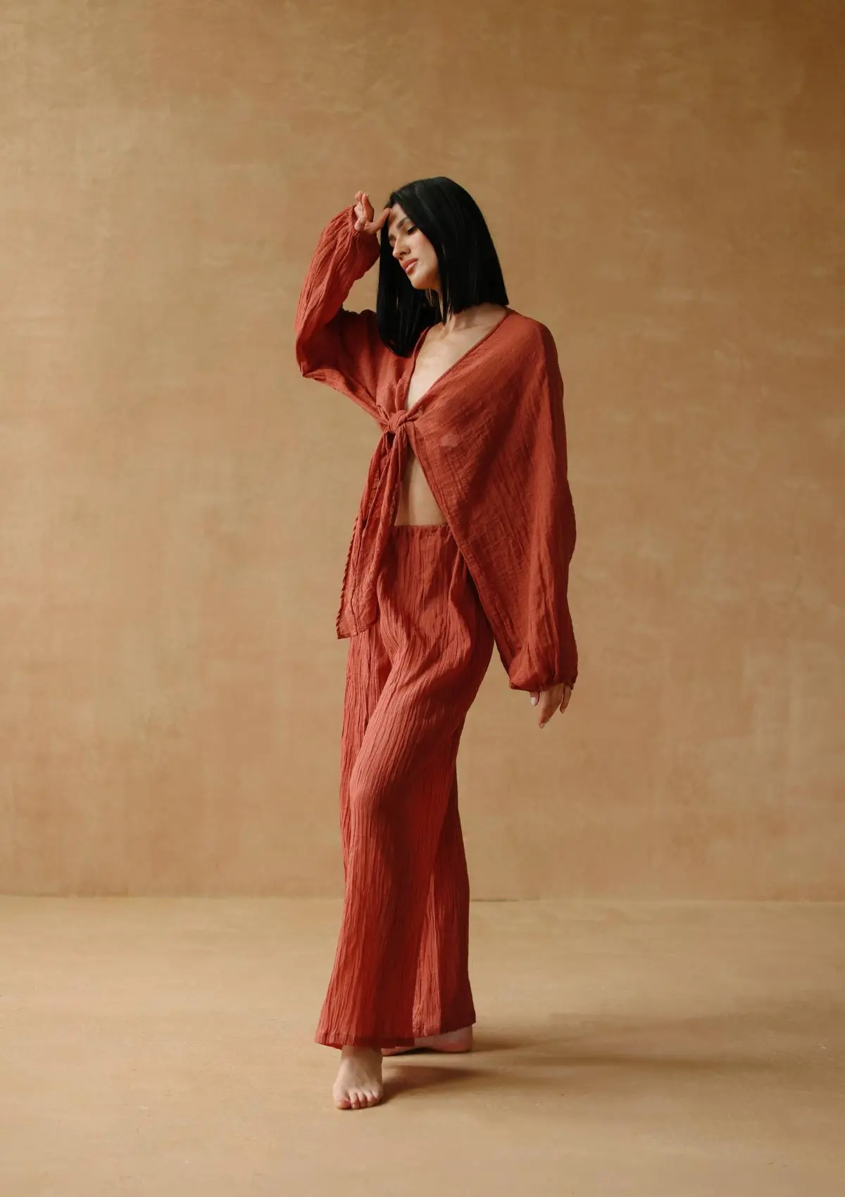 Crafted from lightweight woven cotton gauze, it offers breathability and soft texture. Perfect for layering, it pairs seamlessly with our Ares Trouser or other wardrobe staples.