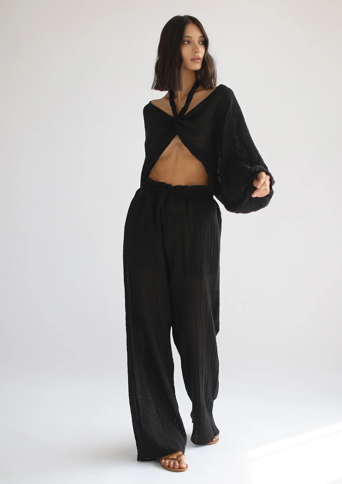The Tai Top embodies effortless elegance with its flowing silhouette and dramatic sleeves. Designed for movement, this open wrap top drapes beautifully, creating a relaxed yet refined look.